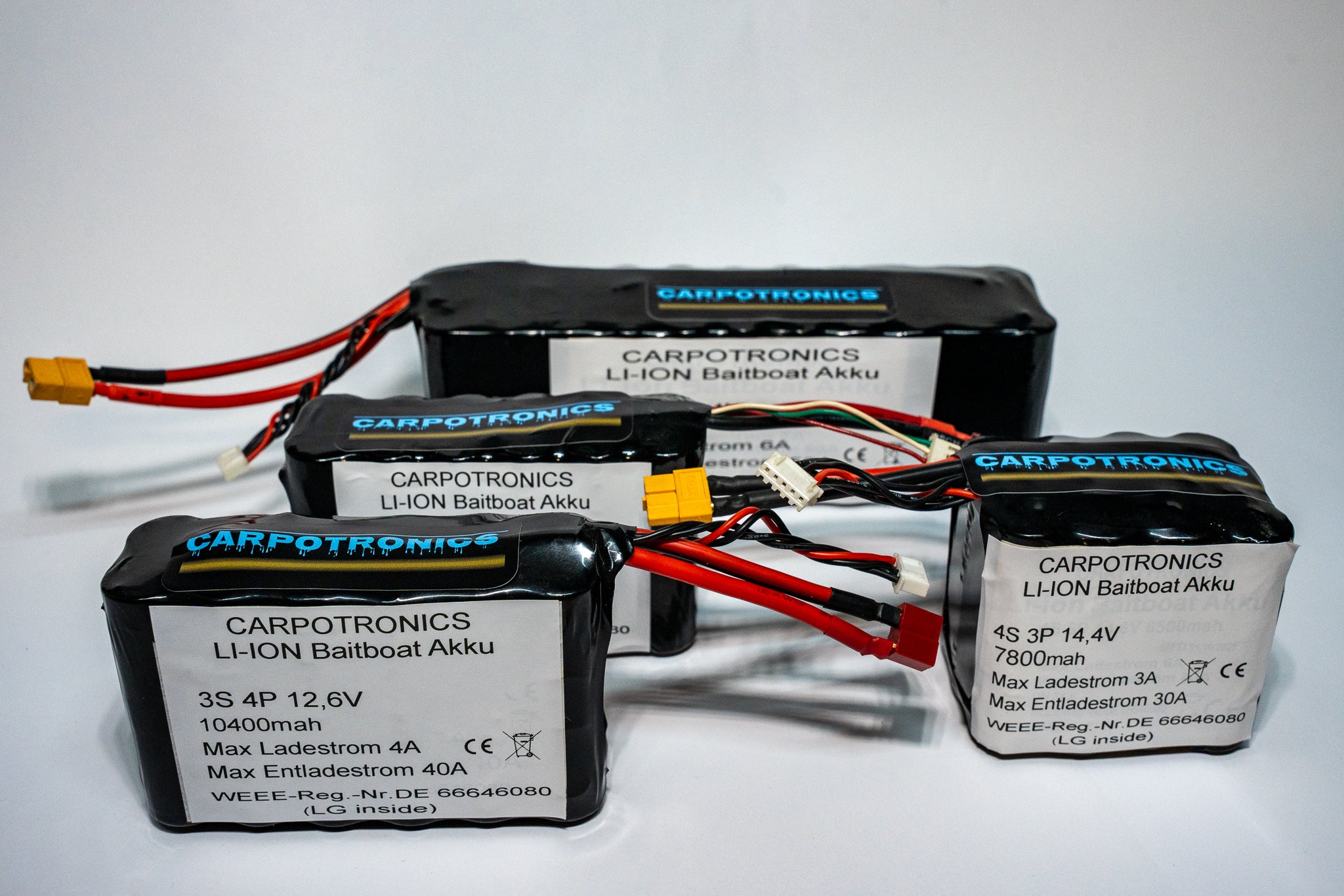 Unsere Akkus sind in verschiedenen Ausführungen erhältlich, darunter 2S (7,2V), 3S (12,6V) und 4S (14,6V). Dadurch decken wir die Anforderungen aller gängigen Futterboote ab.